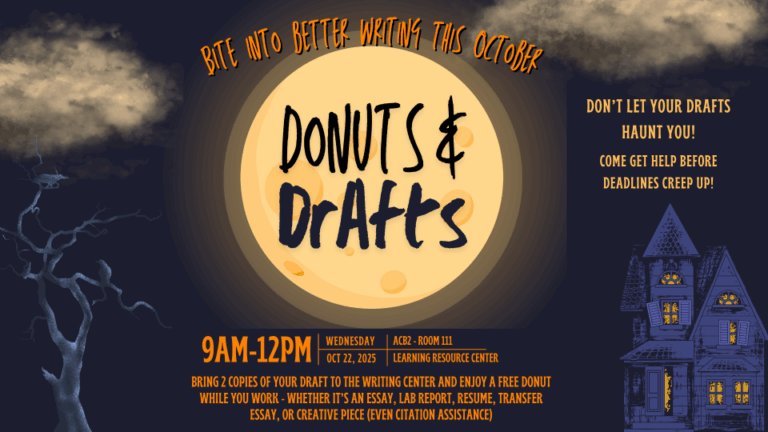 Join us at the Learning Resource Center on the RELLIS Campus for tutoring when you bring two copies of your draft and enjoy a free donut while you work. Whether it’s an essay, lab report, resume, transfer essay, or creative piece (even citation assistance). Come get help before your deadlines!